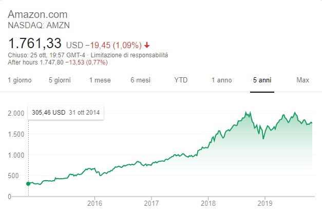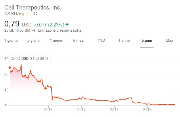 Qui sotto (Prima immagine) possiamo vedere un esempio delle Azioni di Amazon che al 31/10/2014 ogni singola azione era quotata 305,46$, ad oggi (25/10/2019) è quotata 1761,33$ in 5 anni il suo valore è aumentato di circa 6 volte, ciò vuol dire che a fronte di un investimento iniziale di circa 3.000$ oggi quelle azioni sarebbero valutate circa 17.600$, un ottimo guadagno direi… Più sotto (seconda immagine) possiamo vedere invece l’andamento delle Azioni Cell Therapeutics che dal valore iniziale di 24,40$ del 31/10/2014 ad oggi vale circa 0,79$, ossia il suo valore è sceso di circa 30 volte, ciò vuol dire che a fronte di un investimento di circa 3000$ oggi quel capitale sarebbe ridotto a circa 100$. In questi 2 esempi abbiamo visto come a fronte di uno stesso capitale iniziale investito in un caso c’è stato un forte guadagno, ma nell’altro caso una forte perdita.