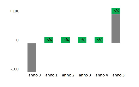 Qui sotto un esempio di Obbligazioni a cadenza annuale al 5% per la durata di 5 Anni. A fronte di un investimento iniziale di 100 a fine dei 5 Anni avrete rimborsato il 100 investito più un 5% per ogni Anno, quindi alla fine dei 5 Anni il guadagno sarà del 25%(5% per 5 Anni = 25%)