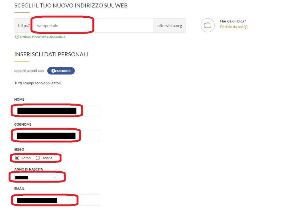 scegliere il nome del sito che sarà del tipo <nome scelto>.altervista.org e completare i campi evidenziati in rosso