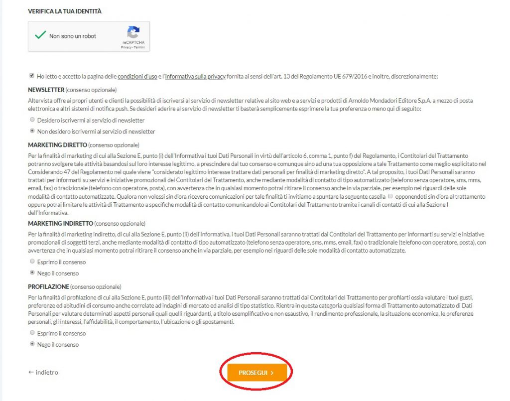 Step 4: Verifica la Tua Identità mettendo il check su “Non sono un robot”, metti il flag su “condizioni d’uso” e poi su tutti i “consenso opzionale” puoi mettere non accetto.