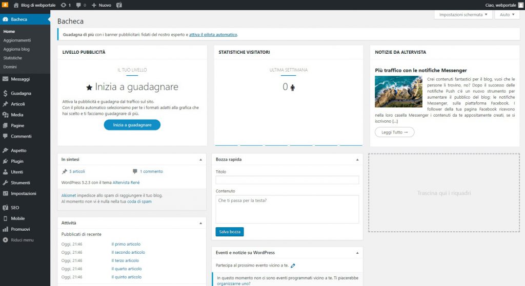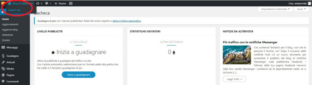 Bacheca di controllo di WordPress, da qui potrete modificare il sito